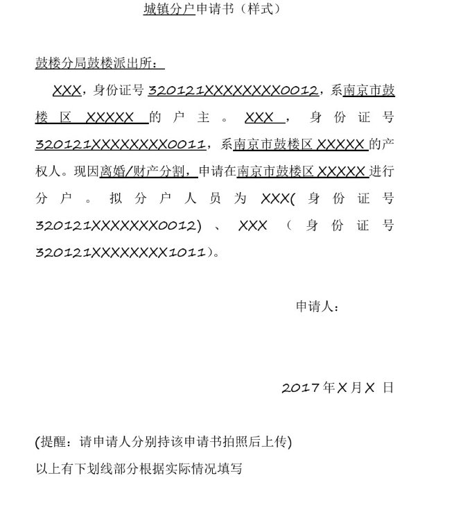 南京城镇分户申请书模板: