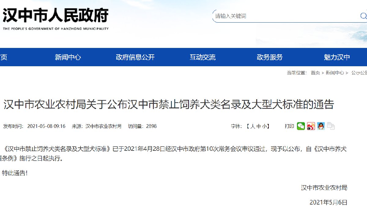 汉中市农业农村局将根据我市犬只的饲养情况,适时调整禁养犬类名录和大型犬标准。