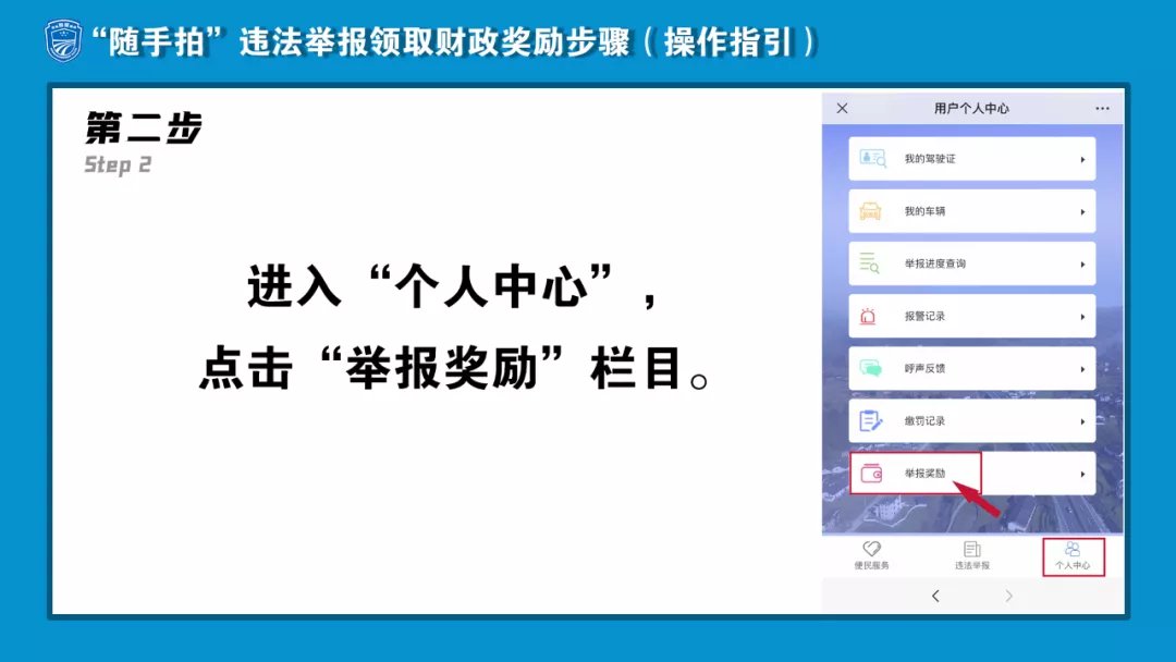 第二步:进入“个人中心”,点击“举报奖励”栏目。