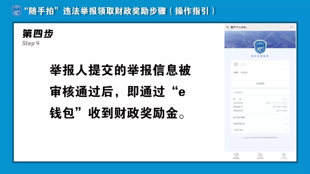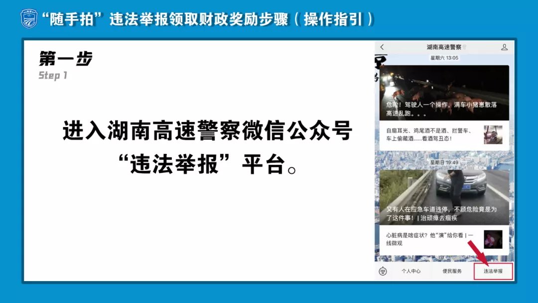 有驾驶人在高速公路存在高速公路占道、违停、实线变道、在匝道导流线区域行驶或停车、货车不按规定车道行驶等违法行为,通过湖南高速警察微信公众号举报可获得30元/起的财政奖励,奖励领取如下:
