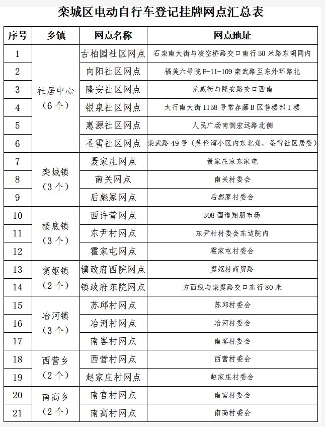 本次集中登记挂牌期间,我区依托村(居)委会,共设置了23个登记挂牌网点,每个网点具体位置,市民可查阅附表,也可登录预约系统进行查看并选择,集中登记挂牌工作结束后,上述网点将撤除,市民可以到交警大队车管站(集中上牌期间,车管站不办理电动自行车登记挂牌业务)登记挂牌。