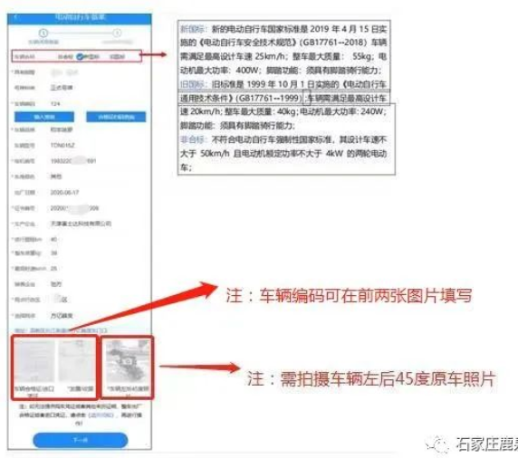 4、旧国标、非合标两类车辆,车辆编码并非必填项,确认《遗失须知》后,再上传一张车辆左后方45°照片即可。