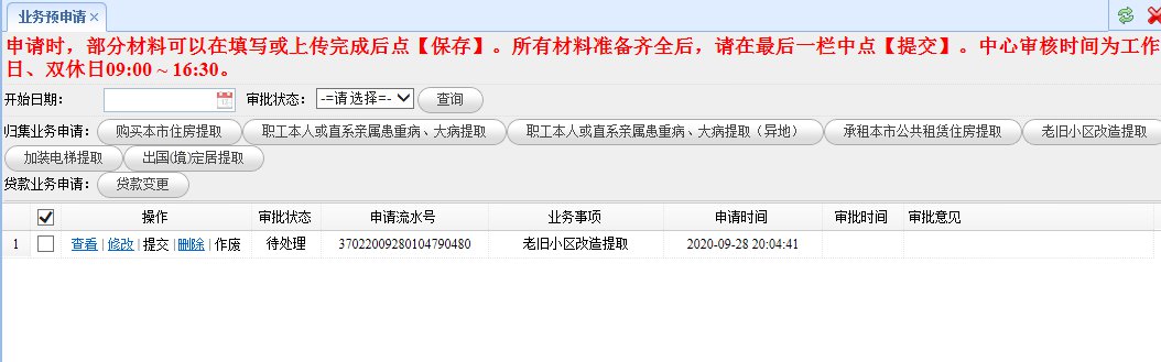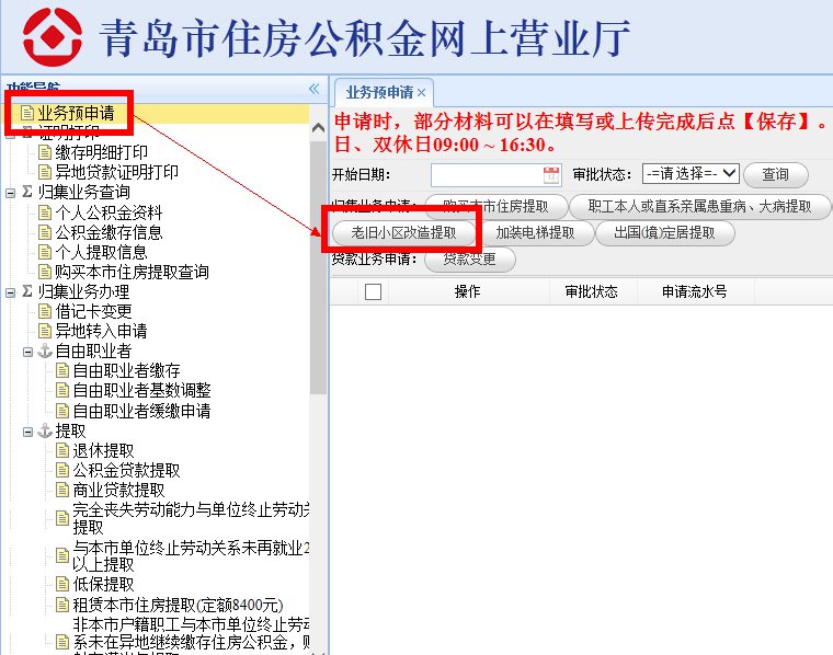 提取申请人在个人专业版网厅中选择“业务预申请”---“老旧小区改造提取”