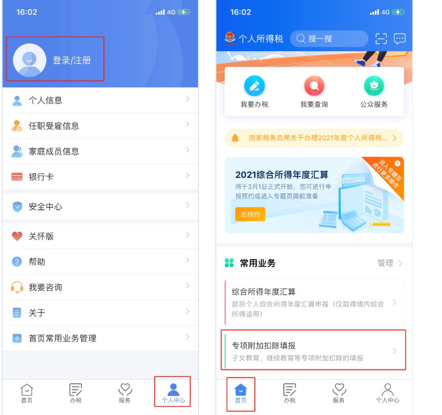 1、下载“个人所得税”APP,点击【个人中心】,登录后在首页处,点击【专项附加扣除填报】。