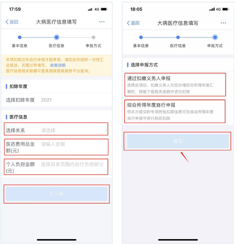 3、选择关系,并填写医疗费用总金额及个人负担金额,点击【下一步】,选择申报方式,并点击【提交】。