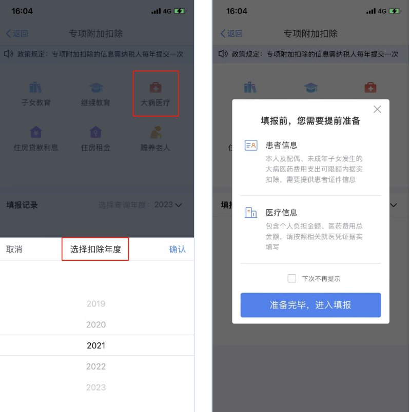 2、点击【大病医疗】,选择扣除年度,准备患者信息及医疗信息,点击【准备完毕,进入填报】。