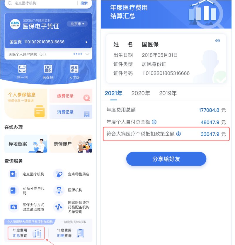 1、打开“国家医保服务平台”APP进入首页,在【查询服务】版块点击【年度费用汇总查询】,即可查询本人2021年度符合大病医疗个税抵扣政策金额。