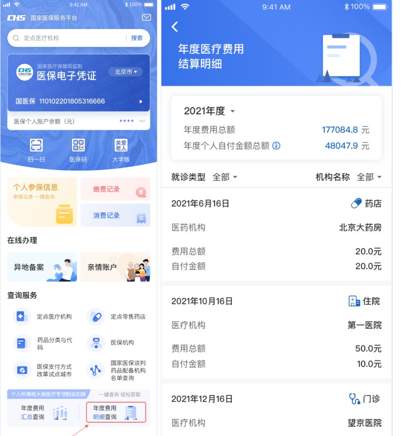 2、如果您还想查看上一年度的医疗费用明细,可在首页【查询服务】版块点击【年度费用明细查询】,即可查询本人2021年度医疗费用结算明细。