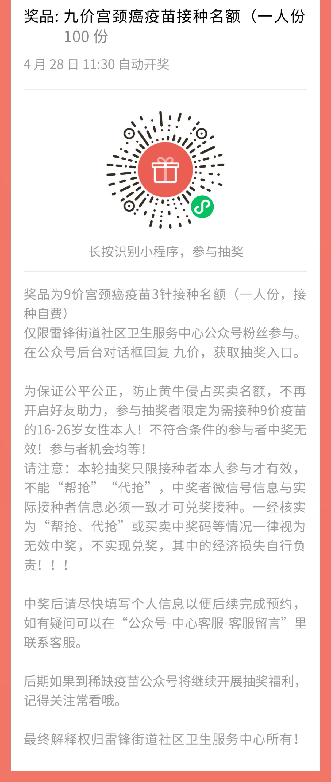 雷锋街道社区卫生服务中心推出了9价HPV接种抽奖活动,具体活动内容如下。