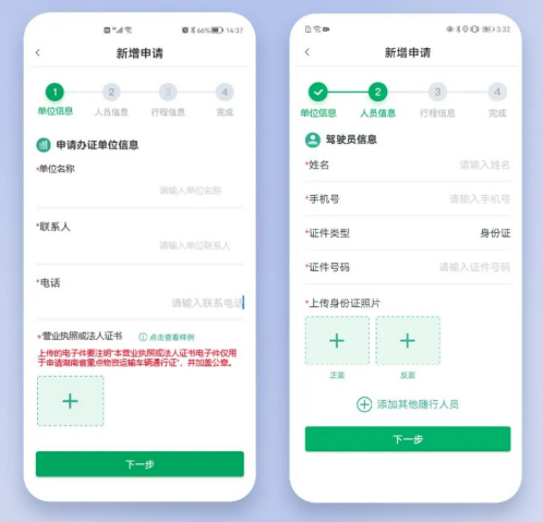 ●点击【通行证申请】,按照提示输入对应的单位信息、人员信息、车辆及行程信息等。
