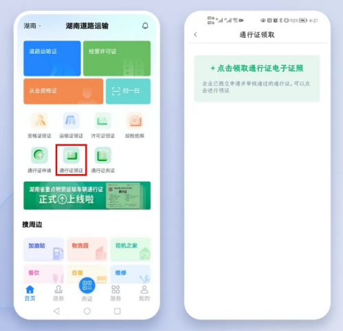 ●点击【+点击领取通行证电子证照】(司机注册完成后,自动匹配领取对应通行证)。