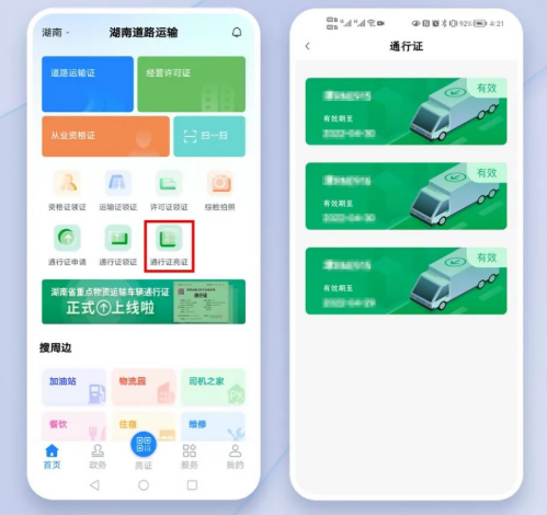 ●用户点击首页【通行证亮证】进入通行证列表,点击相应车牌号码对应的通行证图片,进入通行证详情页面。