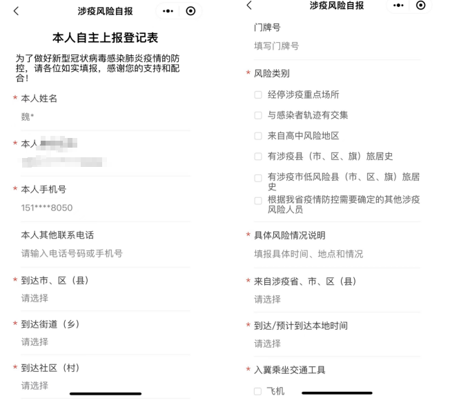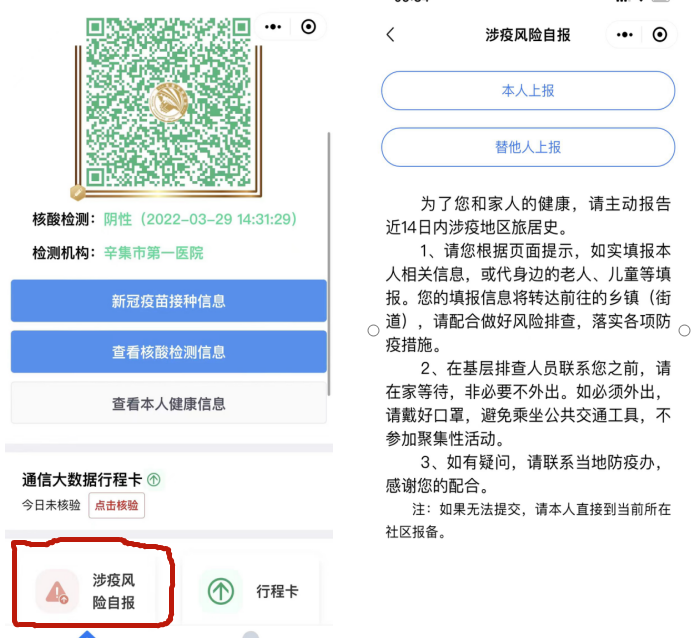 群众打开河北健康码,上滑点击“涉疫风险自报”,按页面提示填报个人相关信息或代他人填报相关信息。