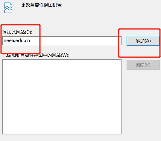 3、同时按键盘 ALT+X+B 三键,在弹出窗口中添加“neea.edu.cn”域名至兼容性站点列表中