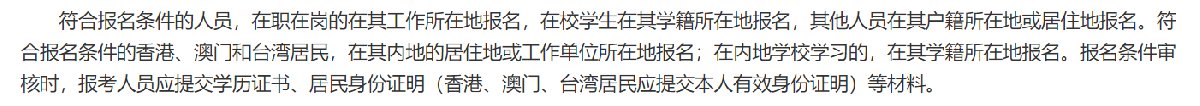 4、香港、澳门和台湾居民,在其内地的居住地或工作单位所在地报名;在内地学校学习的,在其学籍所在地报名