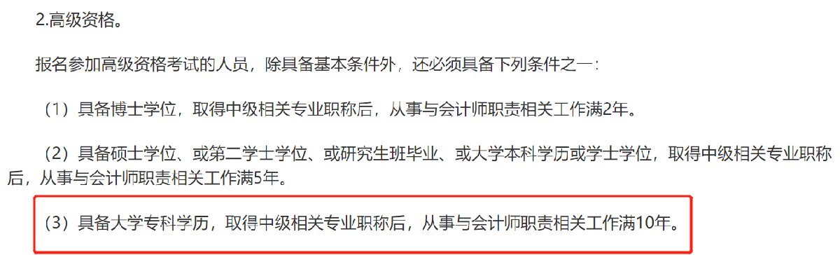3、高级会计师具备大学专科学历,取得中级相关专业职称后,从事与会计师职责相关工作满10年