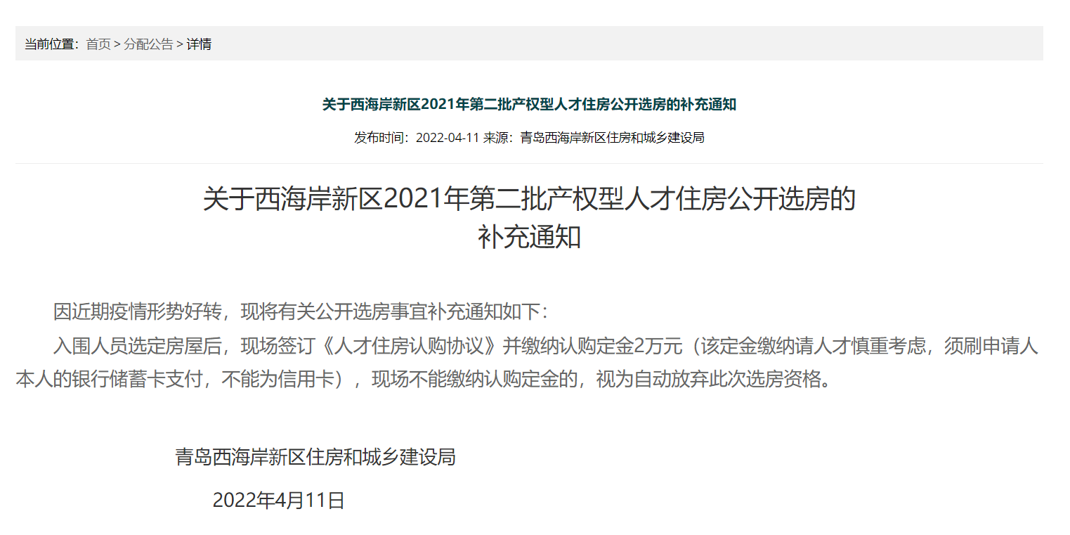 关于西海岸新区2021年第二批产权型人才住房公开选房的补充通知