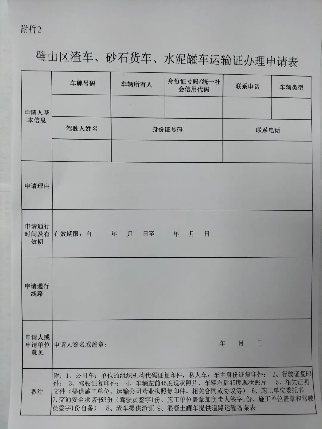 注意:“运输证”、“限行区域通行证”可同时申请办理,相关资料仅需提供一次;工程运渣车需同时提供“建筑垃圾准运证”、水泥罐车需同时提供“商品混凝土道路运输备案表”;一车可申请多名驾驶人驾驶,在上交申请资料时需提供相应驾驶人资料。