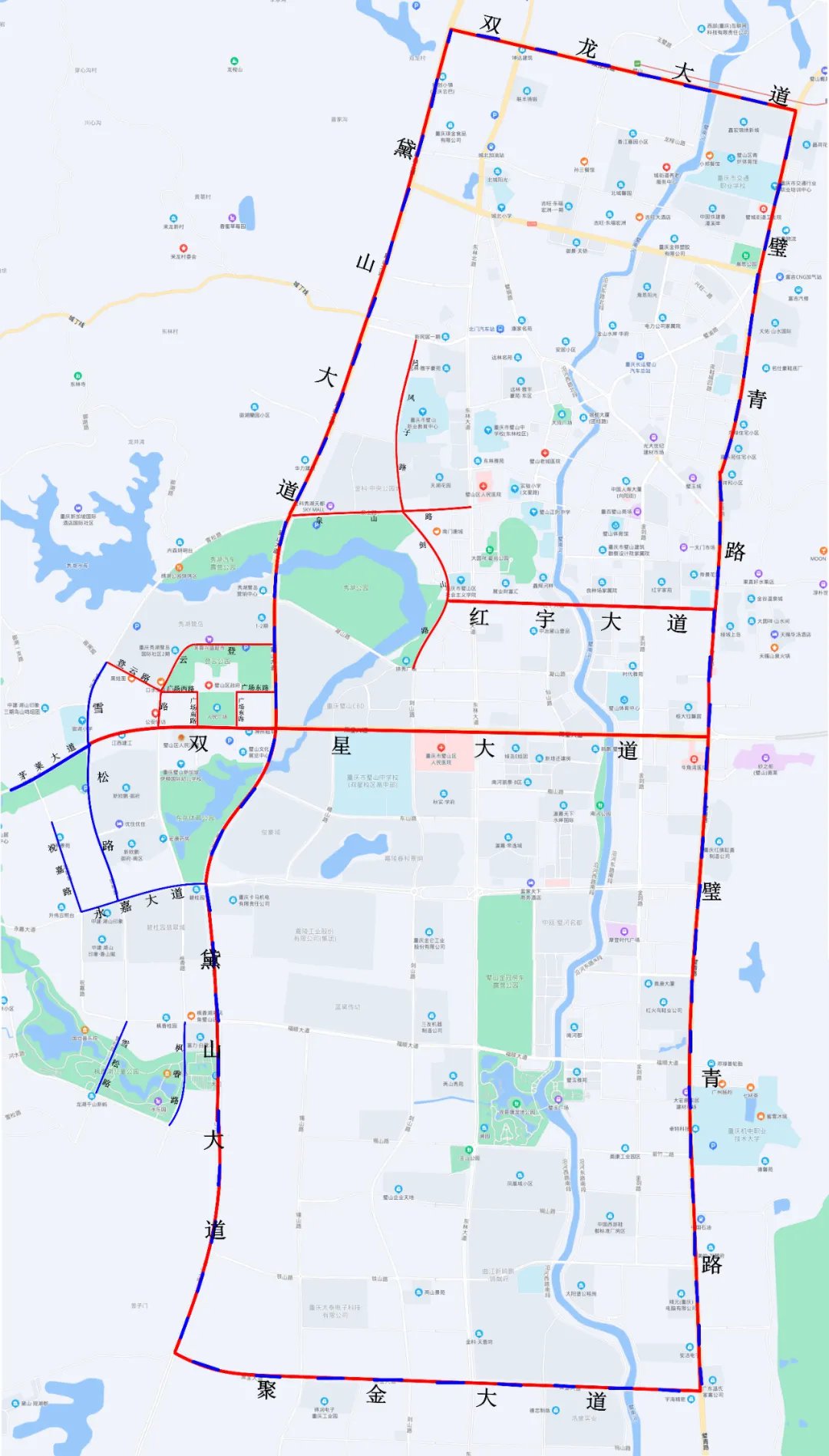 ①限时限行区域:璧青路以西(不含)、黛山大道以东(不含)、双龙大道以南(不含)、聚金大道以北(不含),以上四条道路围成的区域内每日07:00-22:00限行,示意图中用“红蓝相间”线段标注道路所围成的区域(不含标注道路)。