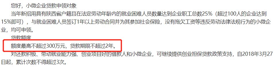 回答:西安小微企业创业贷款期限为2年时间。对还款积极、带动就业能力强、创业项目好的借款人和小微企业,可继续提供创业担保贷款政策支持,自2018年3月27日起,累计次数不得超过3次。