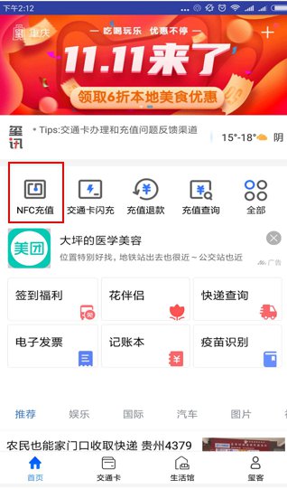 3.在“重庆市民通”APP首页选择“NFC充值”菜单。