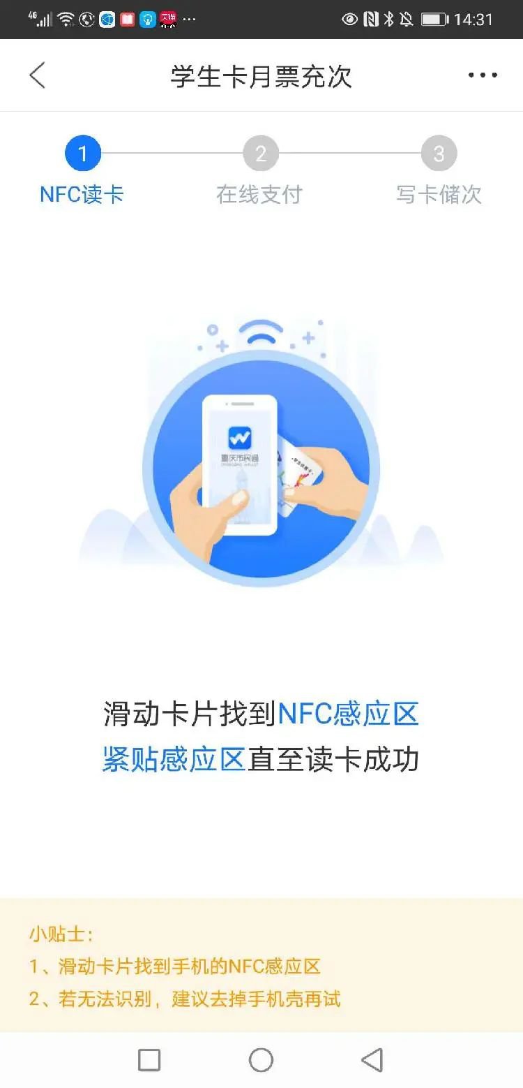 3.NFC手机学生卡月票充次是通过手机互联网进行办理,办理时间视当前网络情况而定,请确保手机网络畅通,并按照手机提示进行操作。