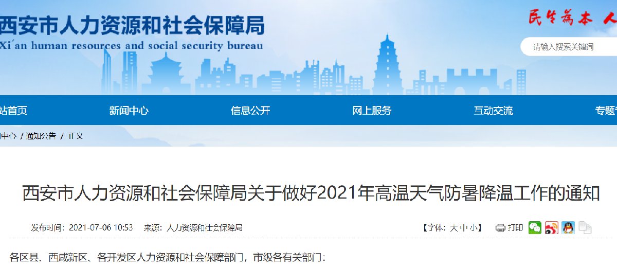西安市人力资源和社会保障局关于做好2021年高温天气防暑降温工作的通知