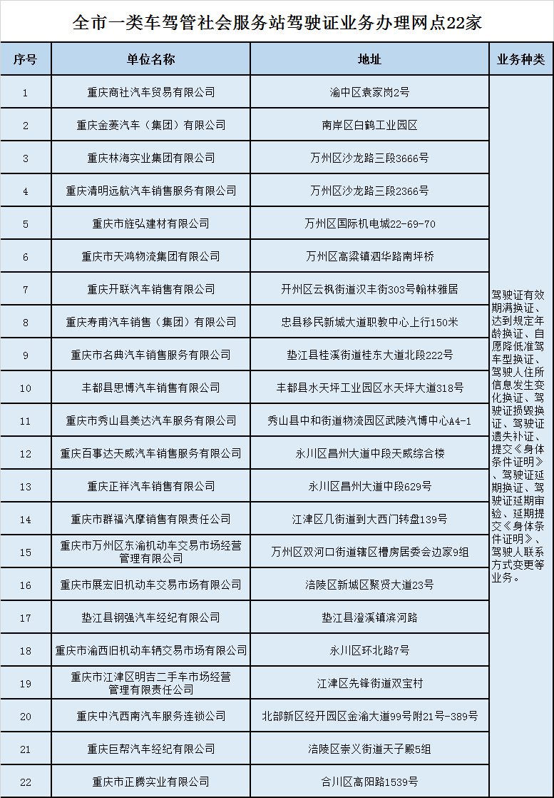 重庆一类车驾管社会服务站驾驶证业务办理网点