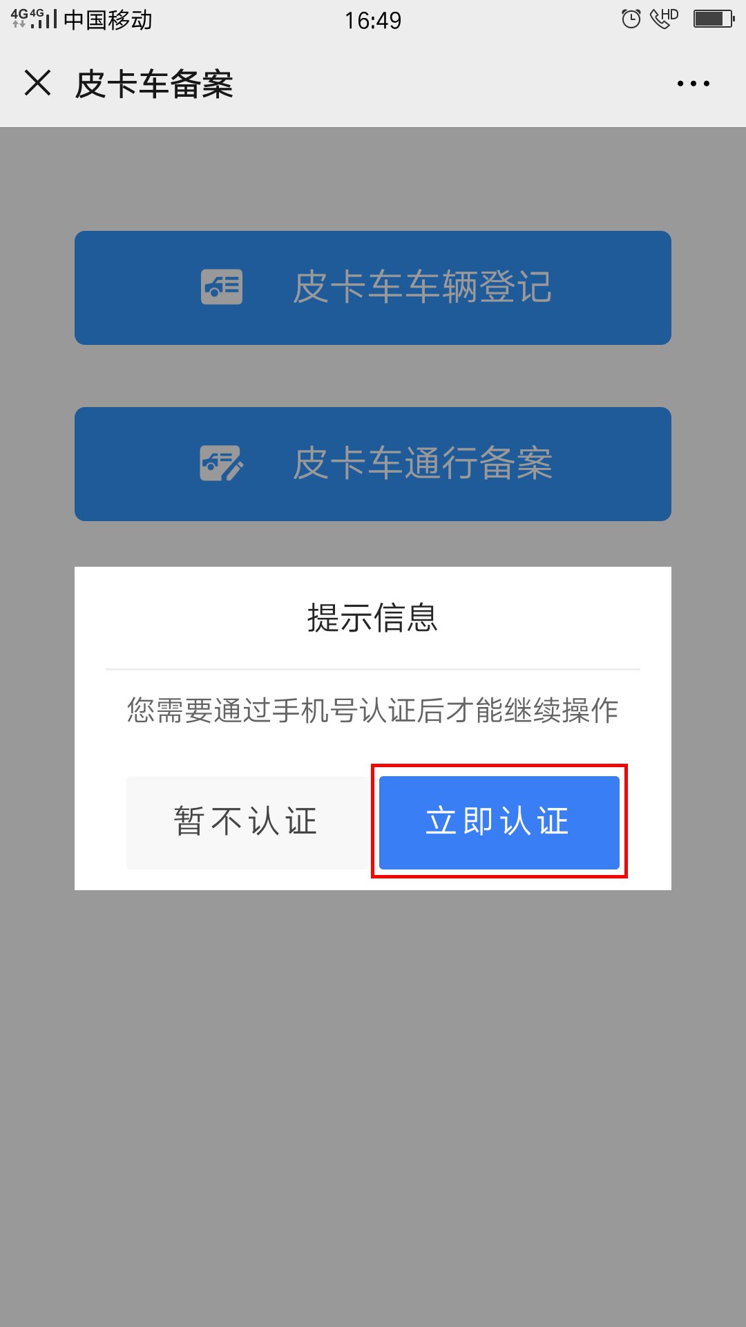 2.选择手机认证(已认证的车辆或驾驶人直接进入第6步皮卡车车辆登记)。