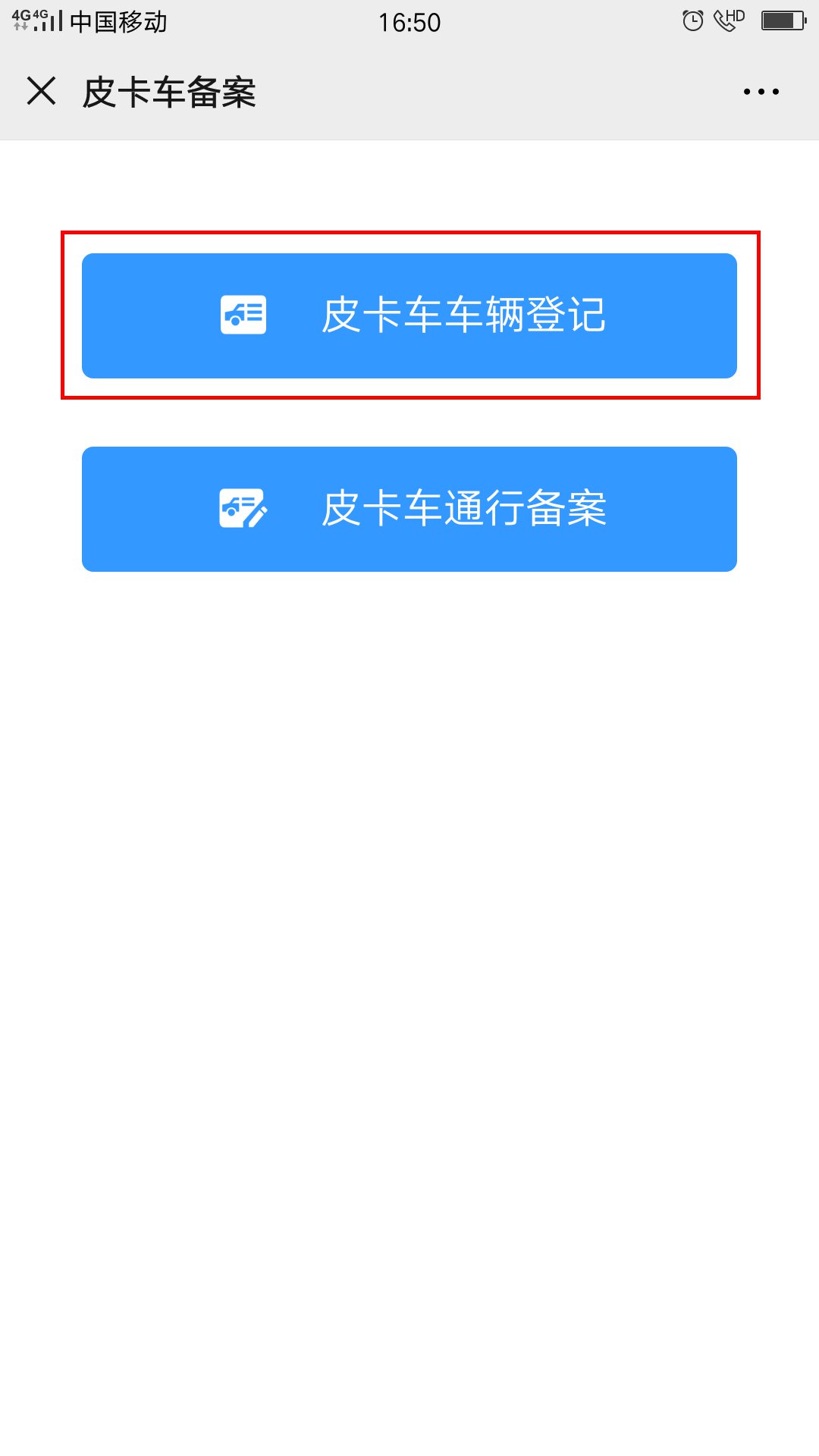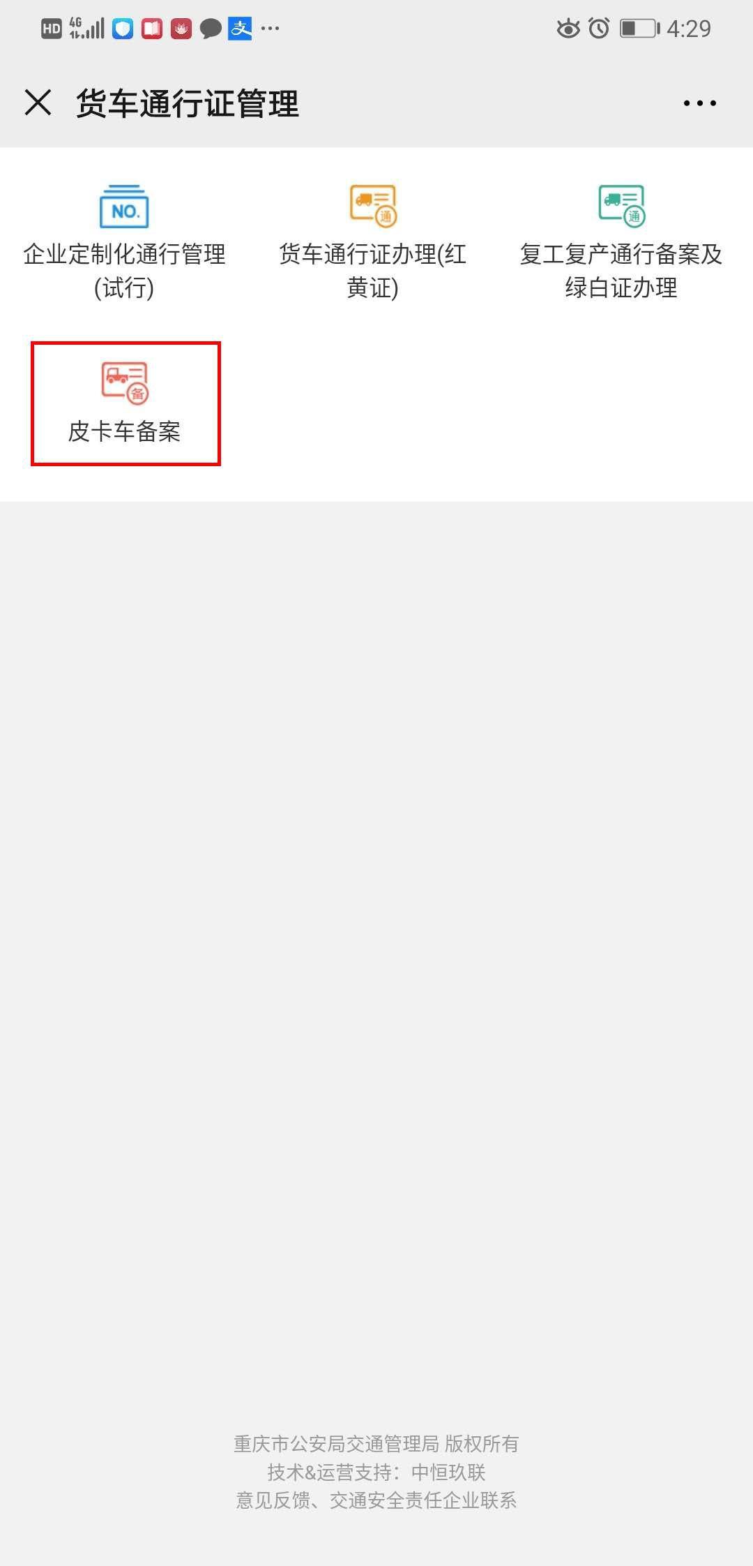 1.选择“皮卡车通行备案”。