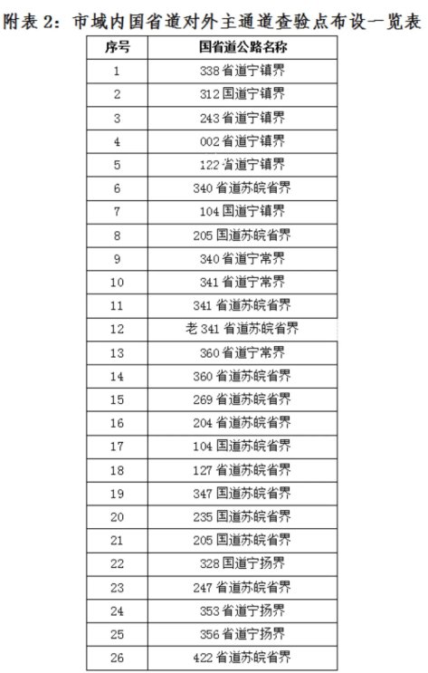 南京市境内共布设“离宁查验点”68个(详见下表),其中高速公路离宁方向主线收费站(服务区)、匝道收费站入口处30个,国省干线公路省市界处26个,县乡道省市界处12个。根据疫情防控实际需要,各区可在辖区内的县乡道路离宁通道动态调整查验点,确保实际防控效果。