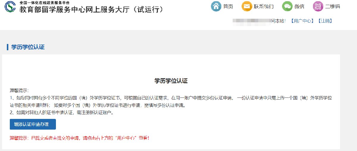 1、登录【教育部留学服务中心网上服务大厅】,点击【学历学位认证】,选择【在线办理】