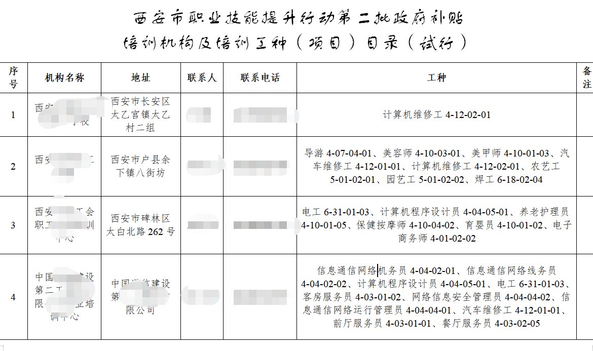 根据省人社厅关于职业目录清单有关工作要求,结合我市技能培训实际,现将《西安市职业技能提升行动第二批政府补贴培训机构及培训工种(项目)目录(试行)》予以公布。