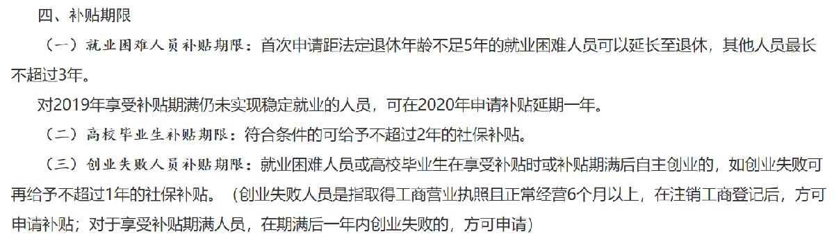 (一)就业困难人员补贴期限:首次申请距法定退休年龄不足5年的就业困难人员可以延长至退休,其他人员最长不超过3年。
