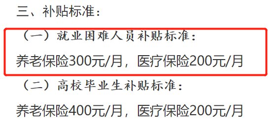 社保补贴实行定额补助:养老保险300元/月,医疗保险200元/月。足年缴纳,则可以补贴养老保险3600元/年,医疗保险2400元/年,总共6000元/年。