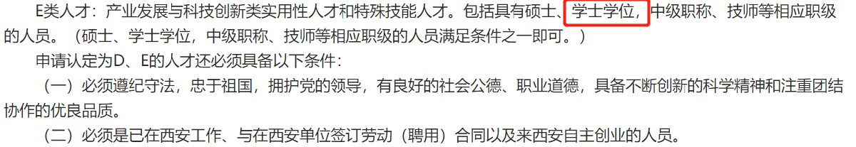 只有大学毕业证不能申请西安E类人才认定。因为人才申请条件之一是具体学士学位的人员。除此之外还需满足以下条件: