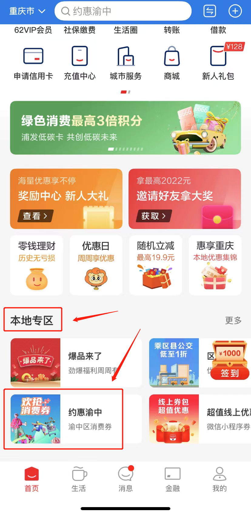 第一步:进入“云闪付”APP,在首页的“本地专区”,点击“渝中区消费券”或在云闪付APP首页搜索框输入“约惠渝中”进入相关活动页面。