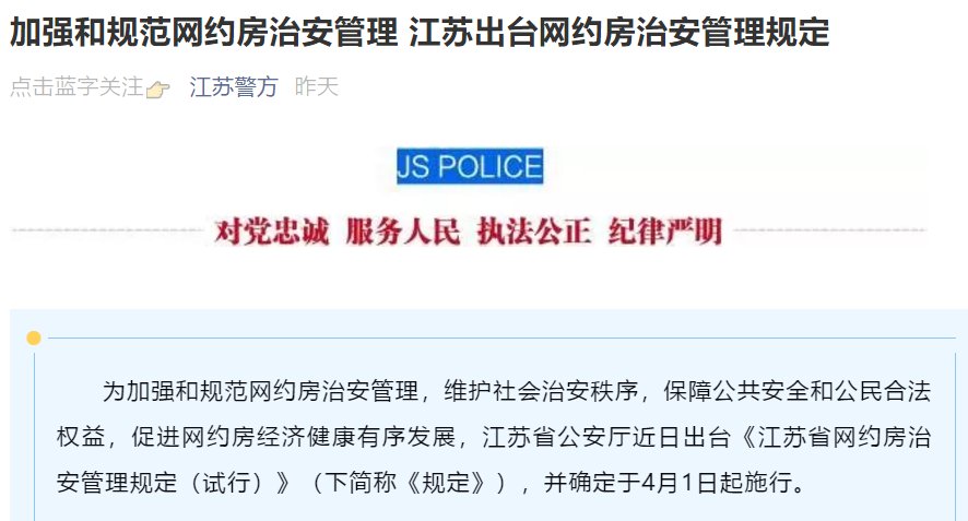 为加强和规范网约房治安管理,维护社会治安秩序,保障公共安全和公民合法权益,促进网约房经济健康有序发展,江苏省公安厅近日出台《江苏省网约房治安管理规定(试行)》(下简称《规定》),并确定于4月1日起施行。
