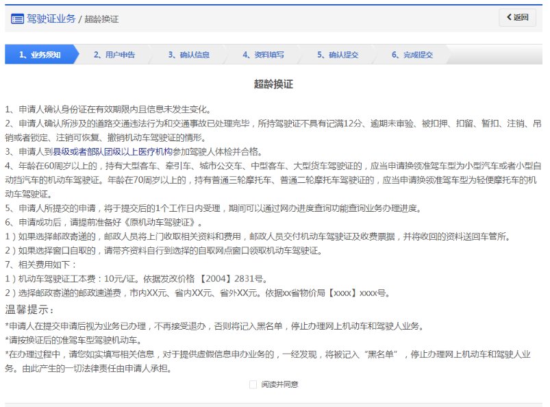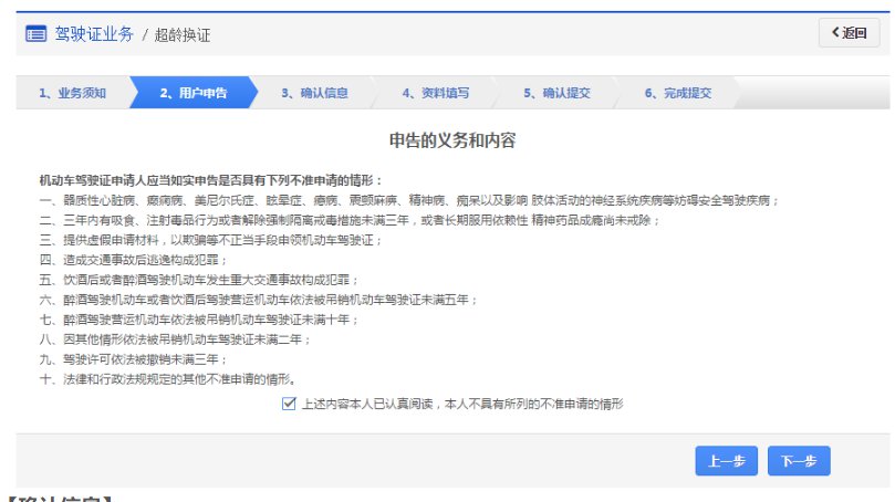 步骤1:【业务须知】在该步骤,用户需认真阅读其内容,包括:办理超龄换证需要注意的各项内容和相关责任,如下图所示。同意的,勾选“阅读并同意”,点击【下一步】进入步骤2【用户申告】。