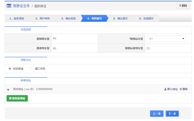 步骤4:【资料填写】在该步骤,用户需认真确认降级后准驾车型,并且选择领取方式是邮政寄递或窗口自取。业务成功受理后,如果选择邮政寄递的,邮政人员将上门收取相关资料和费用,交付机动车驾驶证及收费票据,同时将收回的资料送回车管所。如果选择窗口自取的,则自行到选择的自取网点窗口领取机动车驾驶证。