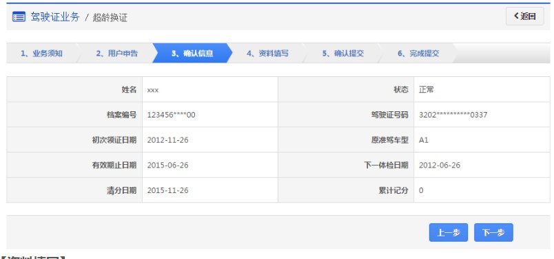 步骤3:【确认信息】在该步骤,界面显示驾驶证的基本信息,用户认真确认各项信息无误后,点击【下一步】进入步骤4【资料填写】。