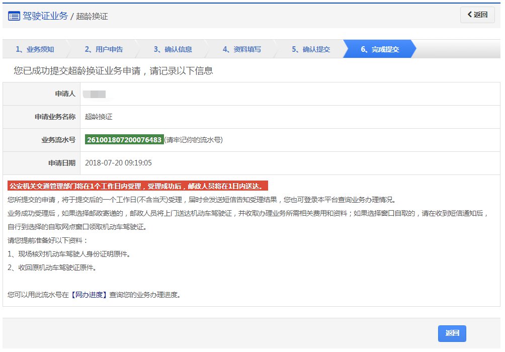 步骤5:【确认提交】该步骤显示用户的驾驶证信息、领取详情以及需要缴纳费用信息,如果平台已开通在线支付功能,显示在线支付详情。该步骤提交成功后,系统生成业务流水号。该步骤提交成功后,系统将于提交后的一个工作日(不含当天)受理(选择在线支付的业务费用支付完成后受理),届时会发送短信告知受理结果。用户可以根据该业务流水号在网办进度中查询业务办理进度。
