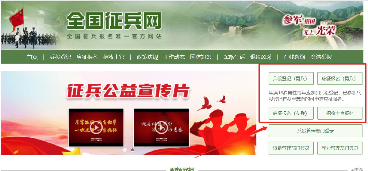 登录全国征兵网,点击“应征报名(男兵)”进入页面;男兵在应征报名之前,要先完成兵役登记,点击“兵役登记(男兵)”进入操作页面。