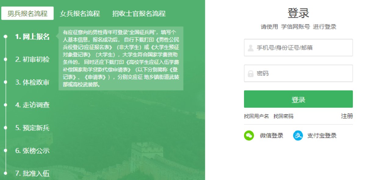 在全国征兵网(点击进入)首页右侧,点击“兵役登记(男兵)/兵役登记(女兵)”;