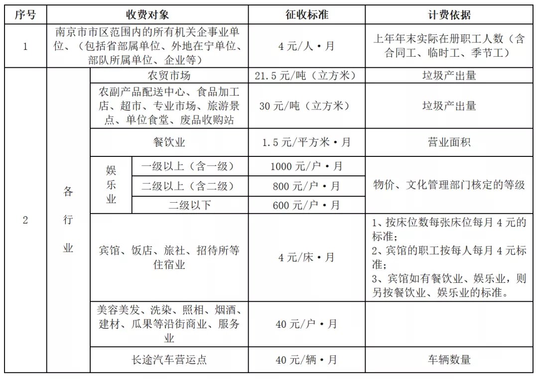 南京市市区范围内的所有机关企事业单位(包括省部属单位、外地在宁单位、部队所属单位、企业等),按上年年末实际在册职工人数(含合同工、临时工、季节工)每人每月4元的标准缴纳城镇垃圾处理费;