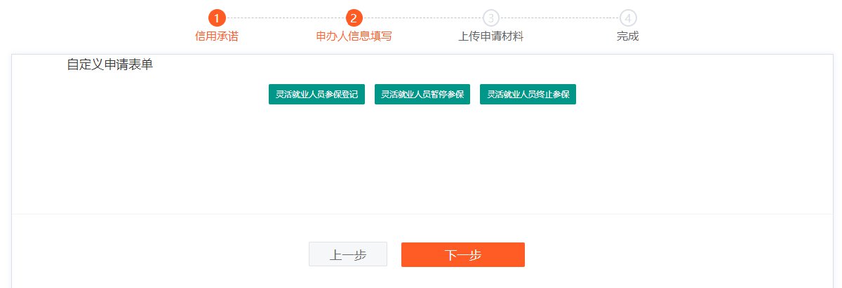 1、用户界面:当用户身份为灵活就业人员时,功能初始界面如下:灵活就业人员参保登记、灵活就业人员暂停参保、灵活就业人员终止参保。