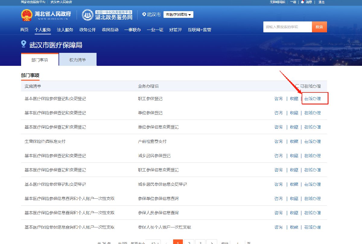 通过湖北政务服务网顶部的按钮打开菜单选择 ”市医疗保障局”,从而进入部门事项,找到职工参保登记选择“在选办理”。