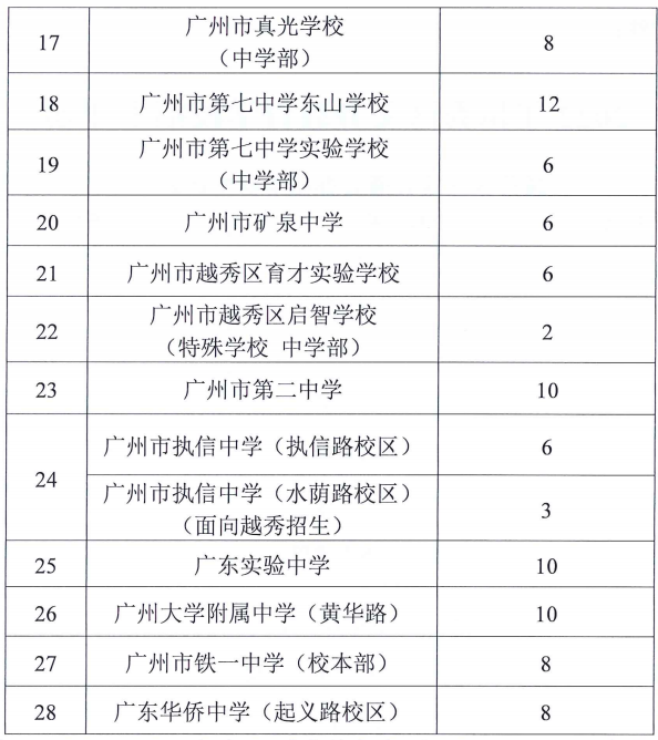 越秀区区辖普通公办初中招生计划: