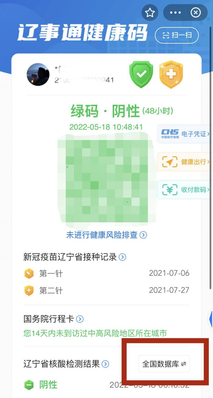 点击支付宝“辽事通健康码”下方“辽宁省核酸检测结果”处,将“省内数据库”切换为“全国数据库”进行查询,或使用支付宝“国家政务服务平台”小程序进行查询。