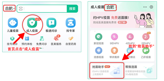 2、选择“合肥”地区,点击首页“成人疫苗” ,进入页面后再点击“抢苗助手”
